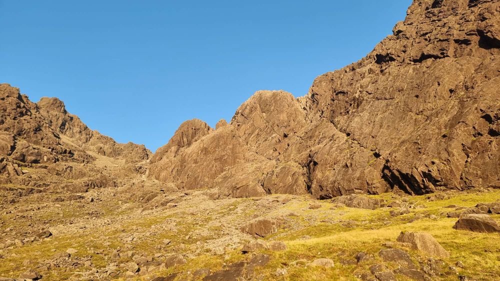 … and a spell of sunny weather coincided with a window in Paul’s calendar for another Scotland trip which would hopefully feature the remaining two routes from the list north of the border. Here’s the trip report from the first of those: Vulcan Wall, HVS 5a, on the East Buttress of Sron na Ciche, in the Cuillin on Skye.