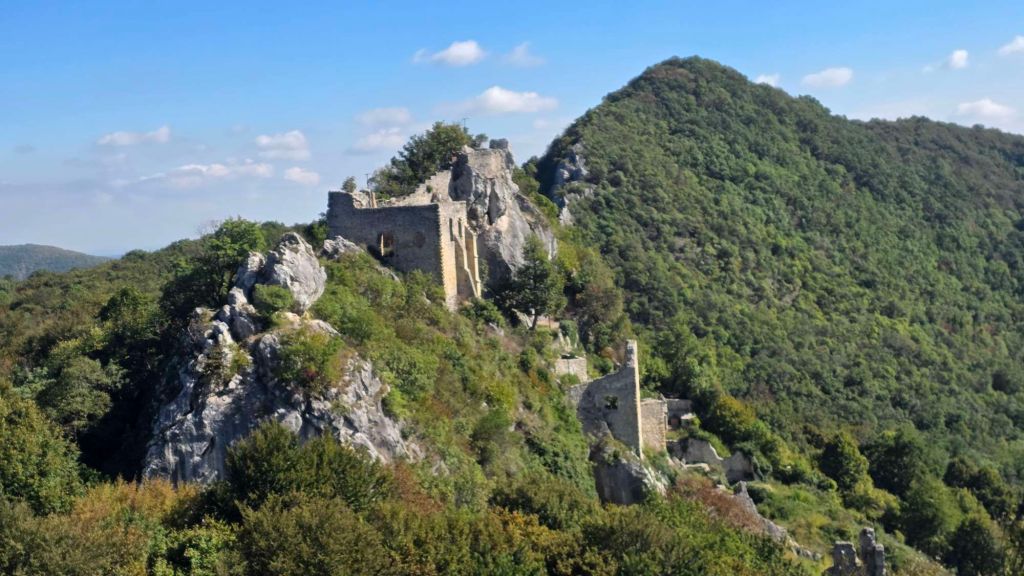 It’s certainly a popular spot, with a “mountain hut” catering for walkers and tourists, as well as the climbers, doing a roaring trade when we arrived on a busy Sunday lunch time. There were probably a dozen local teams on the main Stari Grad sector, accessed via ancient stone staircases winding up through the ruins. We soon got a reminder of the stiff grades on offer in this part of the world, backing off one 6a (John Deere) before just about scraping my way up another (Styr).