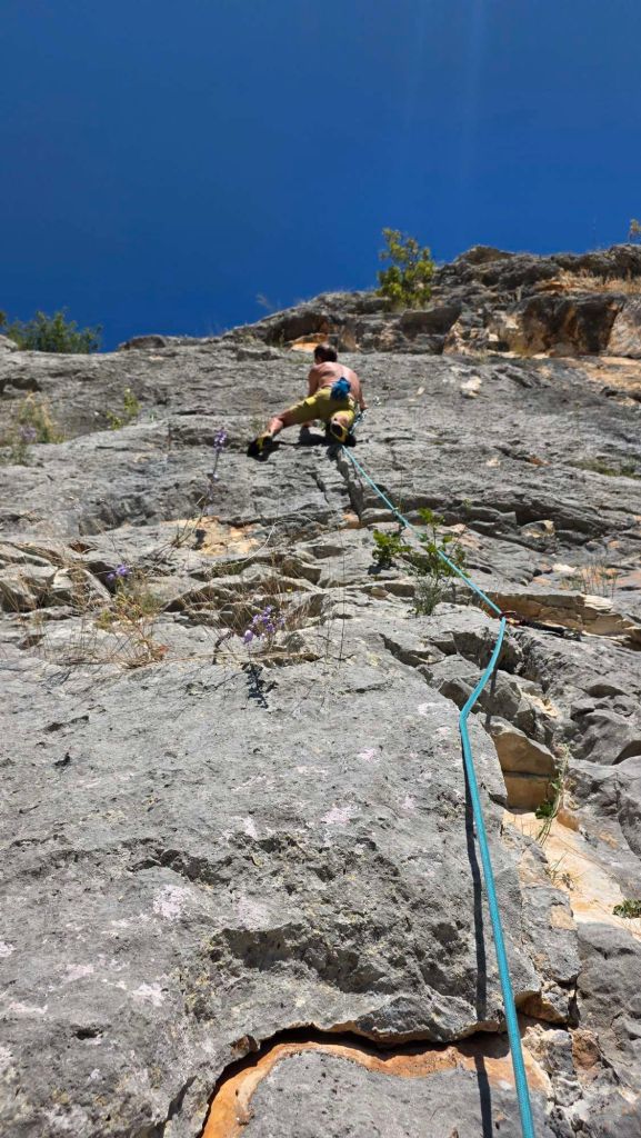 We started on the first / leftmost route, Cvit iz Kamena, 6a, and almost sacked the whole sector. Happily we persevered, and I did the majority of the rest of the routes – all good to great, though tending to be a bit cruxy.