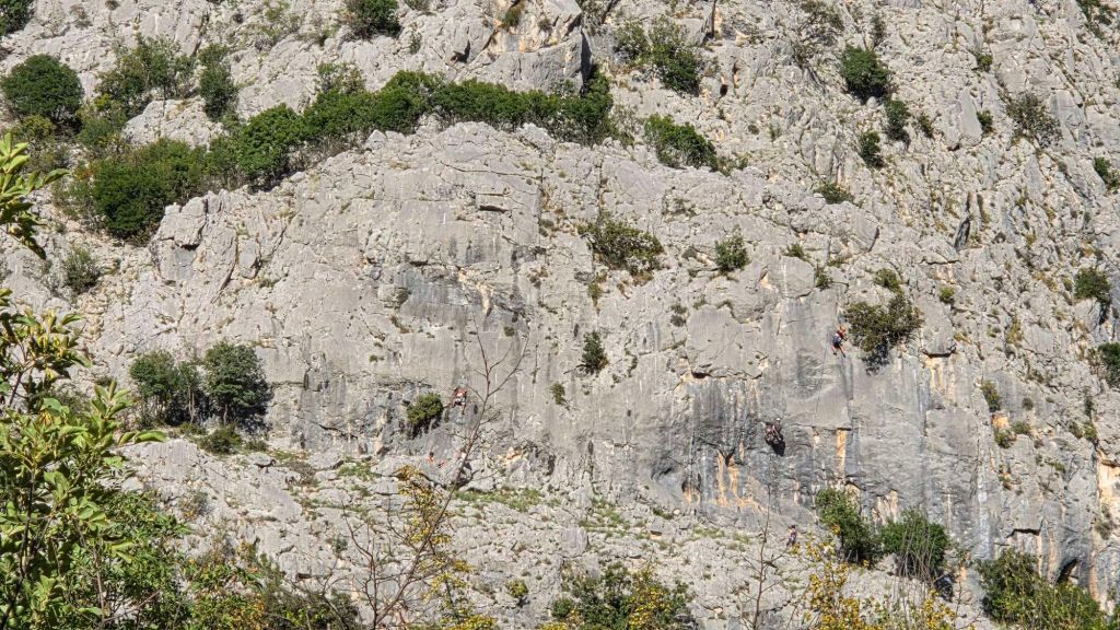 We left Blagaj after a week (see next post on our exploration of the crags around Mostar from the same base), and might be back on the return loop, but I can’t leave this post without another shout out for Autocamp Blagaj: €15 a night is a pretty fair price (you could pay three times that in Austria for a tenth of the welcome) but the value in the restaurant is unbelievable. Our host insists on offering a welcome drink to all new arrivals, followed by a free top-up and then sends you away with a complementary bottle of wine. Dinner of excellent grilled fish, a salad and delicious apple cake to finish, plus four glasses of wine and yet another complementary bottle to take away came to £20 between us. Now that’s a bargain.