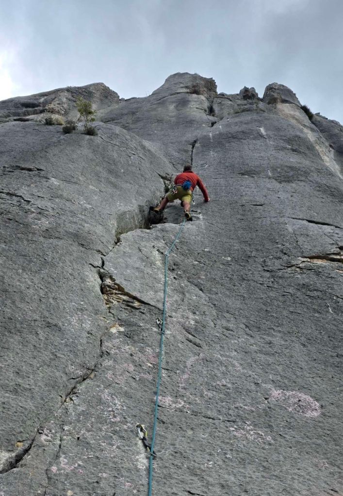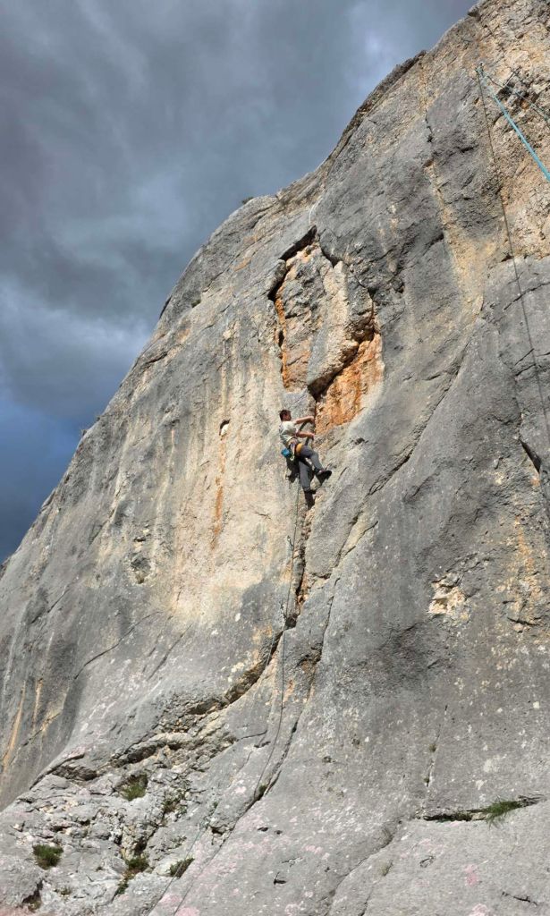 Our chosen objective, Dulimanov sokak, turned out to be a fun and reasonably graded trip (we’d set out with modest aspirations, having been properly poned on our first day). 100m of climbing in 3 pitches, all 5ish (different topos had different grades). You can just about rap the route with a 60 but the final rap to the ground is a bit of a stretch and you’ll need to scramble down a few metres. Tie a knot and be wary, or take an 80 to be sure.
