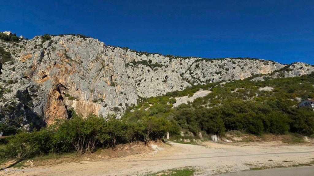 You can just about make out the line, just left of opening of the “Green Cave” in the middle of the modest-looking wall in the centre of the shot above (which is over 100m tall) in the pic below. That gives you some idea of the scale of the orange wall, which must be at least 300m. This is the cliff from which the river emerges, and the location of the Tekija / monestary. Sadly there’s no climbing, presumably for that reason.