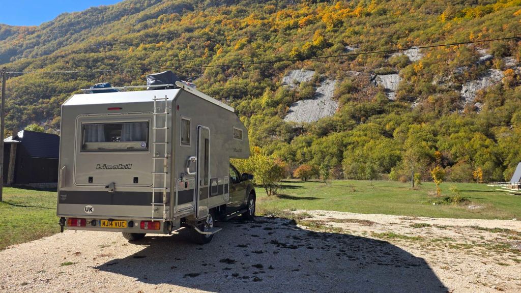 The main road continues south along the valley, but we’d been making for a “nearby” campsite. Nearby as crow flies, but accessed through more side tunnels and hairpins, gaining a fair bit of height in the process. Beautiful tranquility and simplicity at CAMPING ZELENI GAJ (GREEN FOREST), with a warm welcome to match. Our host was easily old enough to be my mum, but wielded her smartphone and Google translate to regail us with an explanation of how the waggy-tailed puppy “came with some cyclists and stays – ignore him if he is boring”. Frosty overnight…