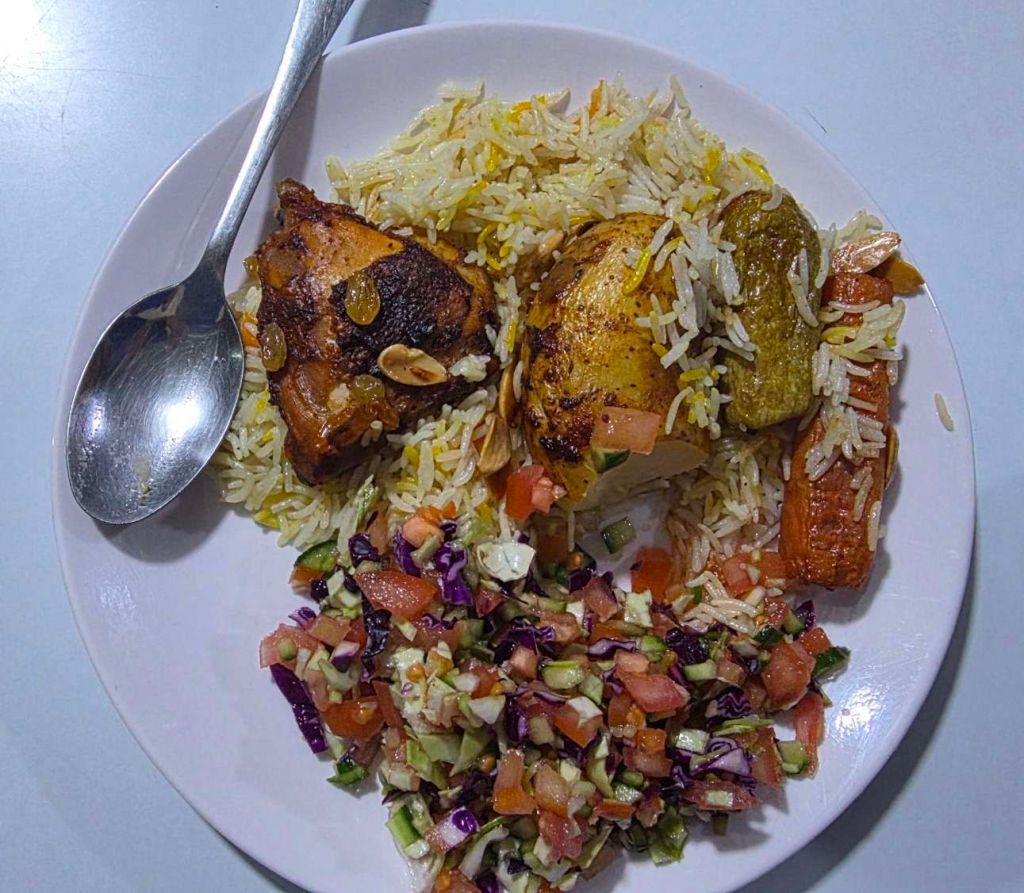 Chicken and rice with vegetables and fresh salads – tasty, wholesome and filling (though worth mentioning that chicken and rice did feature quite regularly on the menu over the coming days…)