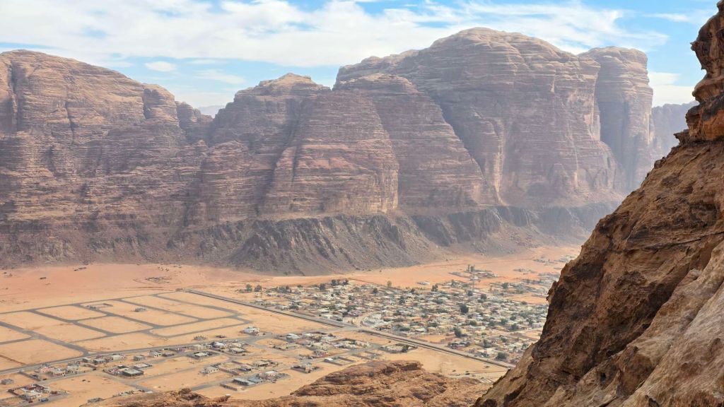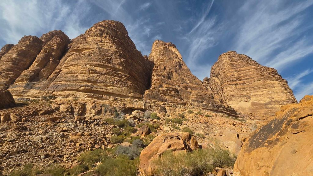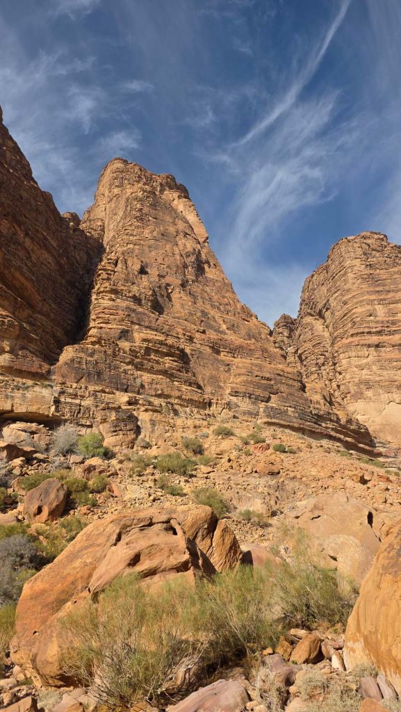 The following morning, the full majesty of the landscape comes into view. Towering sandstone rock faces dominate both sides of the Wadi and extend as far as the eye can see in both directions. The village itself has grown massively since Tony’s early exploration, and now sprawls somewhat scruffily (with more development in progress) but it doesn’t take the shine off the stupendous setting.