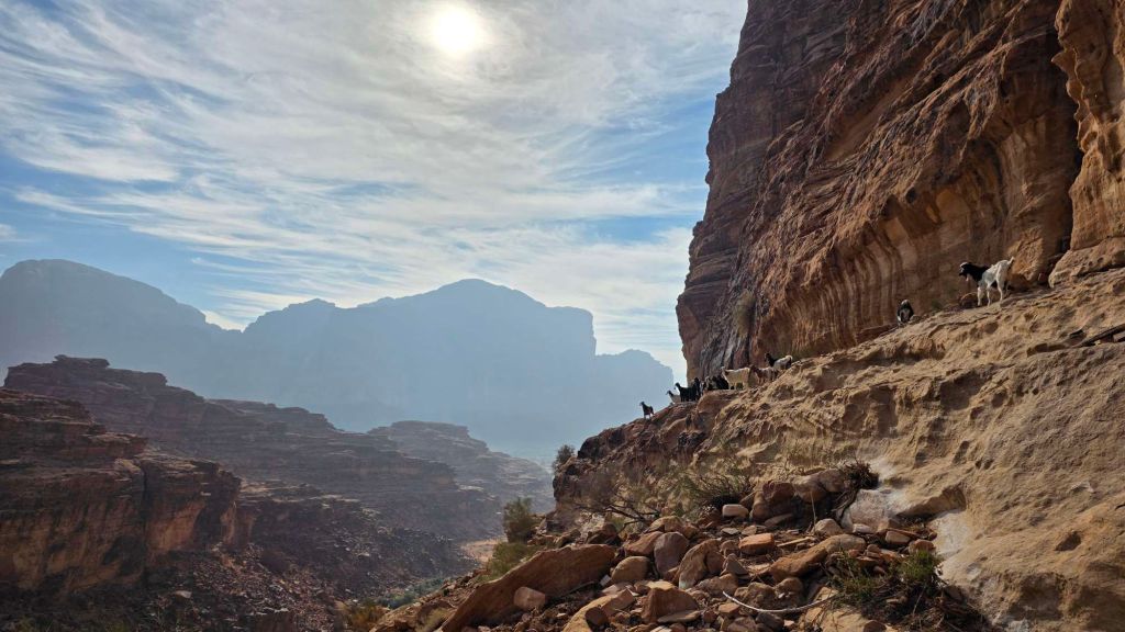 … and the cutting back leftwards to the start of the route. 29.585376° N 35.414030° E Clearly marked by a herd of goats, but also a huge boulder that you start behind.