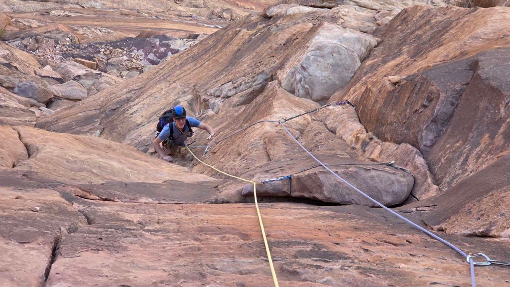 Fairly straightforward but mildly harrowing (especially if you aren’t tuned in yet) climbing leads to a ledge. P4 is up another long crack system.