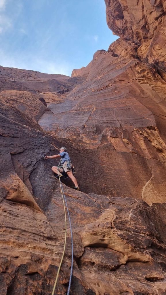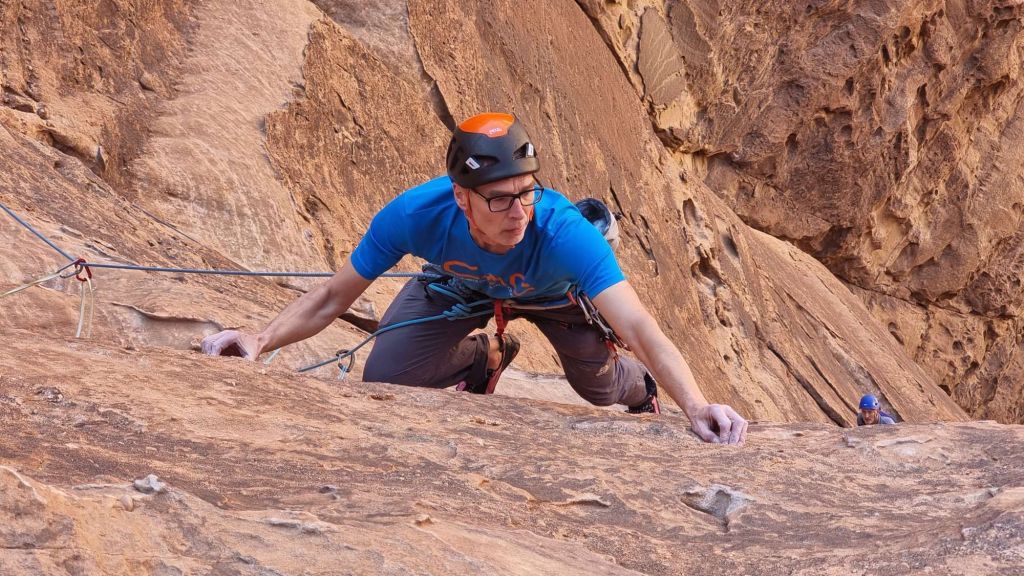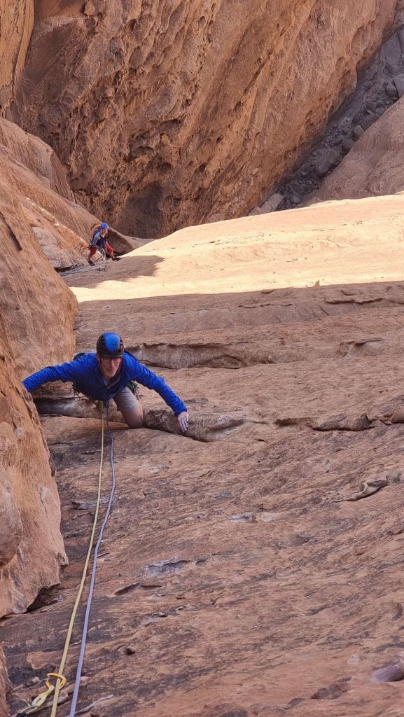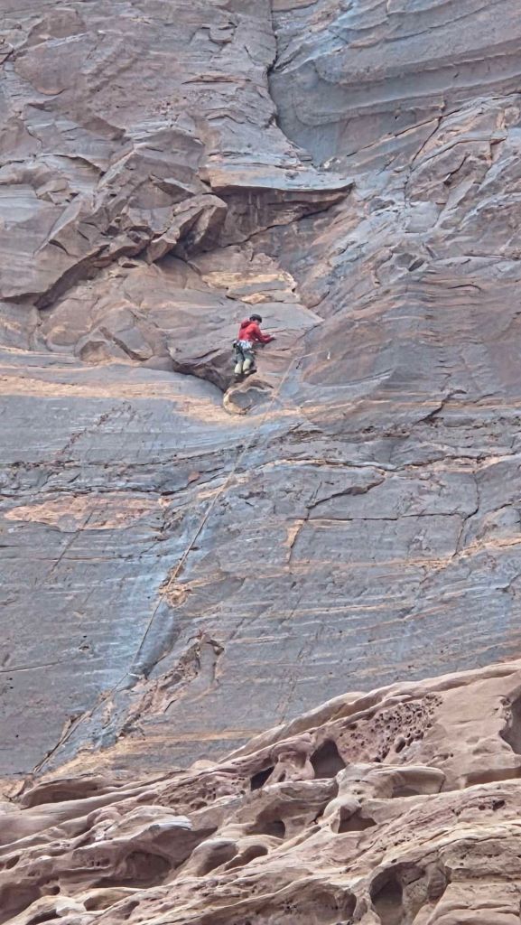 The Star of Abu Judaidah weighs in at ED1 6c (6b obl) spread over 250m of sustained climbing in eight pitches. It is set in the remote Barrah Canyon, accessed by a 45 minutes “Jeep” taxi ride through the desert wilderness, which feels a long way from the hustle and bustle of the town (literally and figuratively). They call them “Jeep” rides, but the ubiquitous 4×4 “ship of the desert” is definitely the Toyota Landcruiser, with examples spanning decades of the mark. Hamdan’s pride and joy is a very swanky new model, and we were cosetted in air conditioned comfort as we sped over the sands, accompanied by a commentary on the passing landscape and routes. (Outward journey and return pickup for £60 for 4 to 6 people).