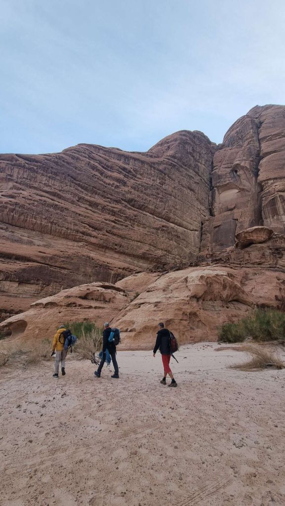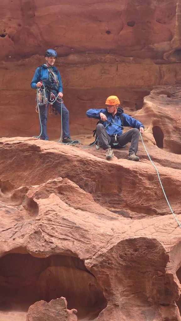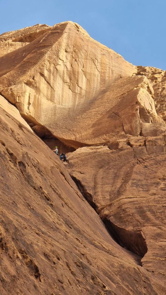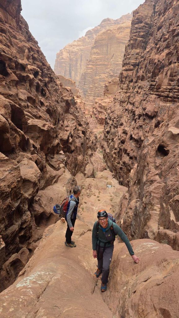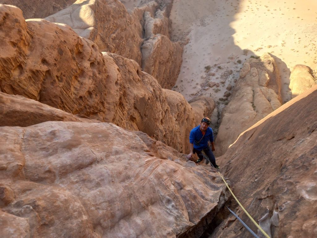 Back at base, well before teatime, a quick headcount revealed that we were two short. A call from Neil and Dave revealed that they were still on top of Jebel um Ejil. They’d topped out on Via Salim Musa in reasonable time (though the modest grade needs taking with a dose of salt) but then hadn’t managed to find the descent. Faced with the option of a chilly but safe impromptu bivvy, or blind questing in complex canyons in the dark, they’d decided on the sensible option.