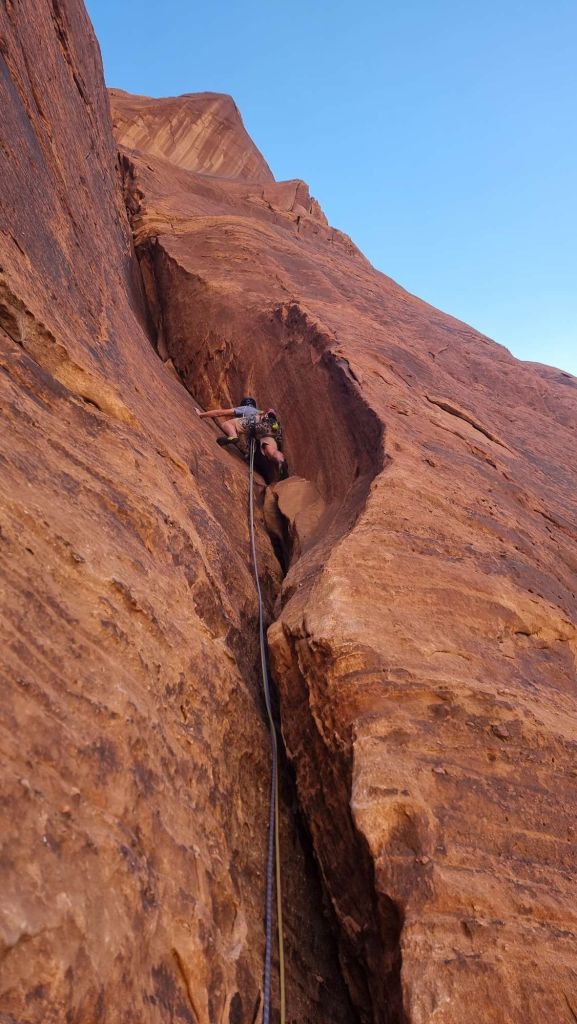 P4 sees the crack system narrow and the angle steepen, not a great combo, and there are a couple of sections that don’t feel easy for 6b.
