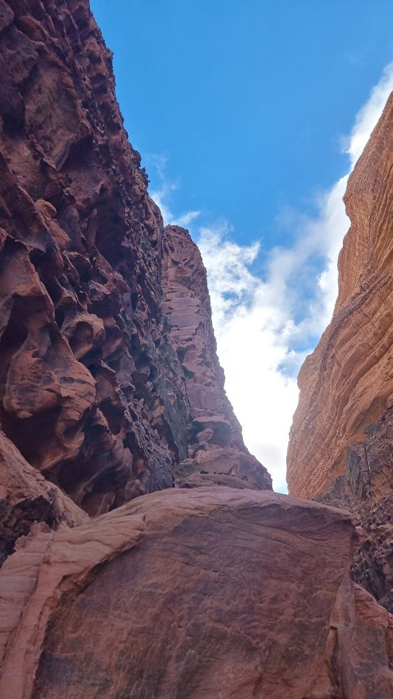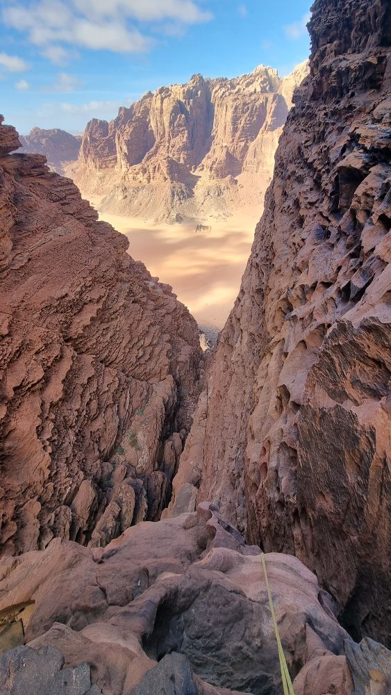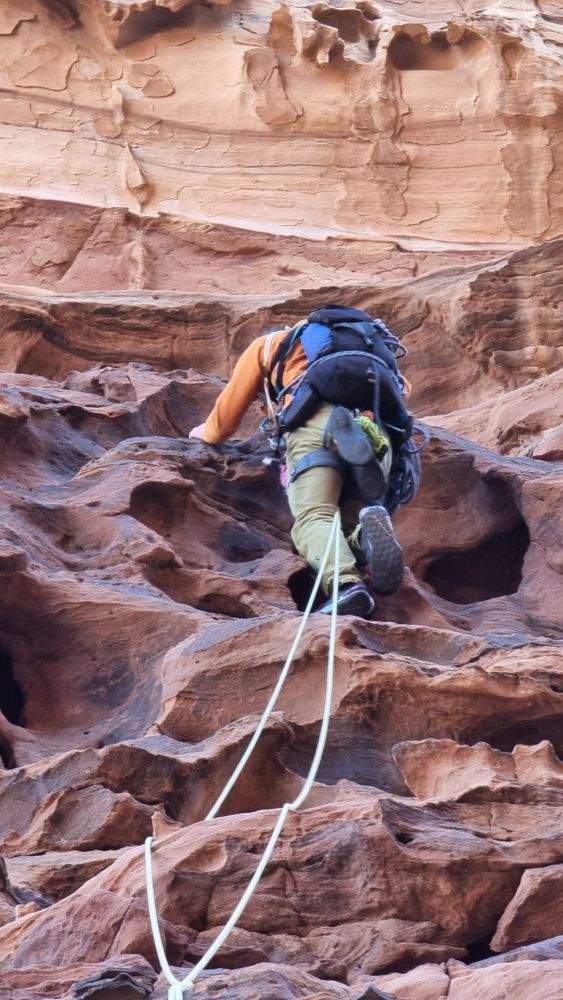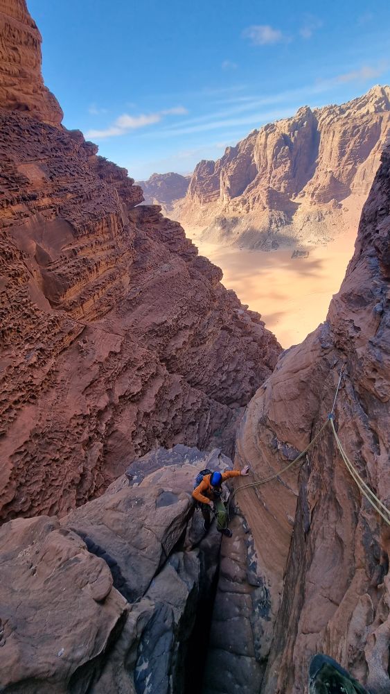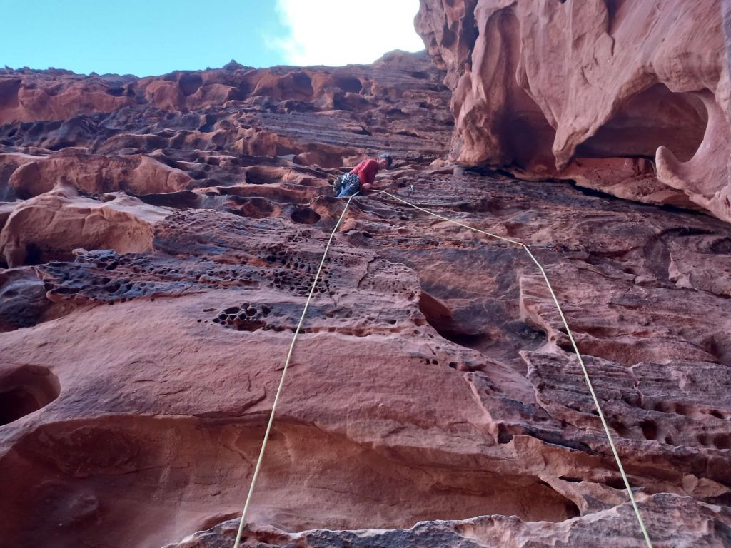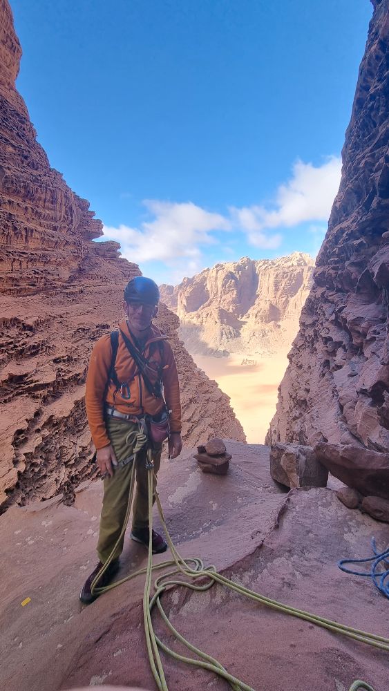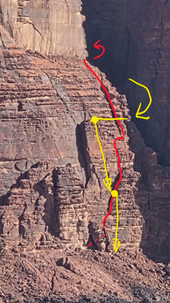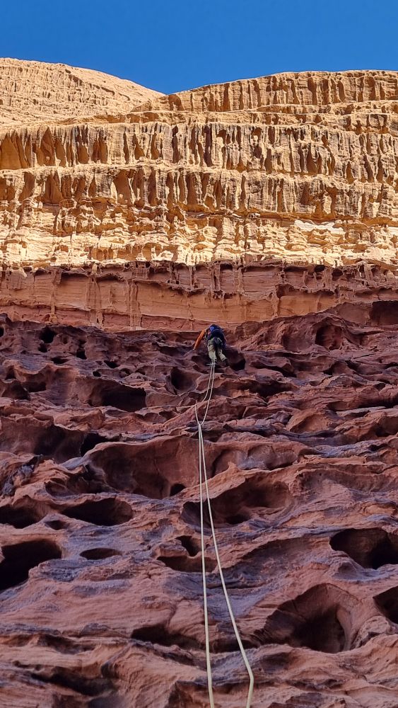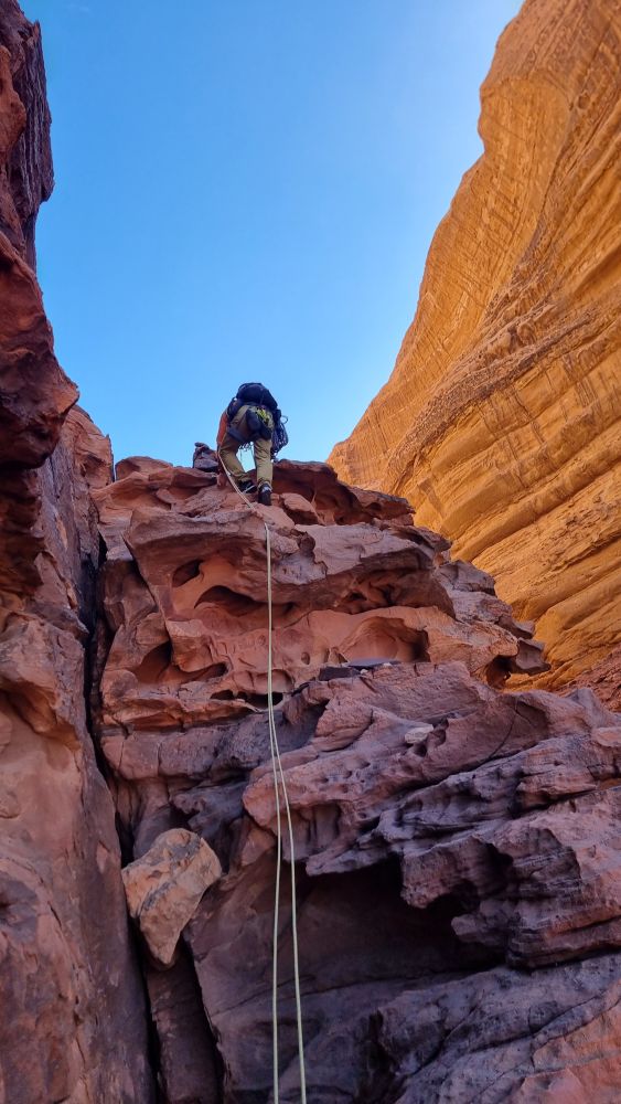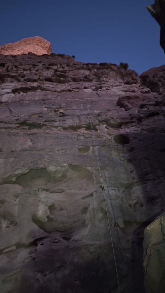 The topo indicates that a shelf is traversed from the end of the Siq and we scoured the wall for a line of cairns to identify which of the numerous shelves we should take, to no avail. A tempting rap point saw me exploring even further down, then retracing my steps from a vertiginous dead-end. In the end we plumped for the most likely candidate and traversed fairly easily out of the depths of the Siq and around onto the face. We then spent about half an hour looking for a “flat-topped pillar” and the penultimate rap point without success, then deciding to create our own and debating various less-than-ideal options – Headtorches on now. In the end we navigated to directly above the GPS coordinates of the lower rap point, found a suitable bollard to wrap some tat around, and set off into the unknown with the mournfull strains of the call to prayer echoing up from the village below. As I passed the halfway mark, my headtorch beam picked out a shiny square in the gloom below. Result, we’d absolutely nailed the final rap point to within a couple of metres!