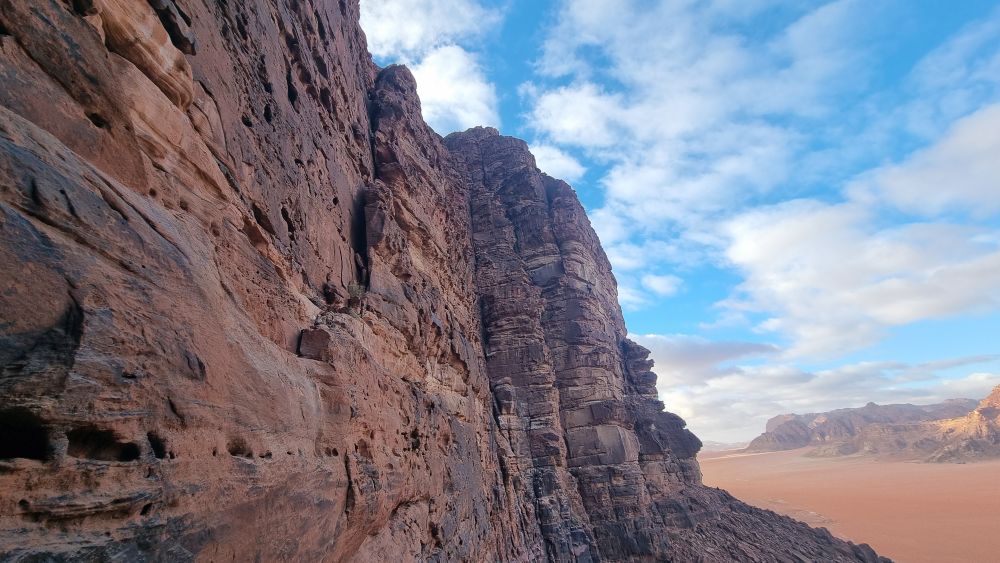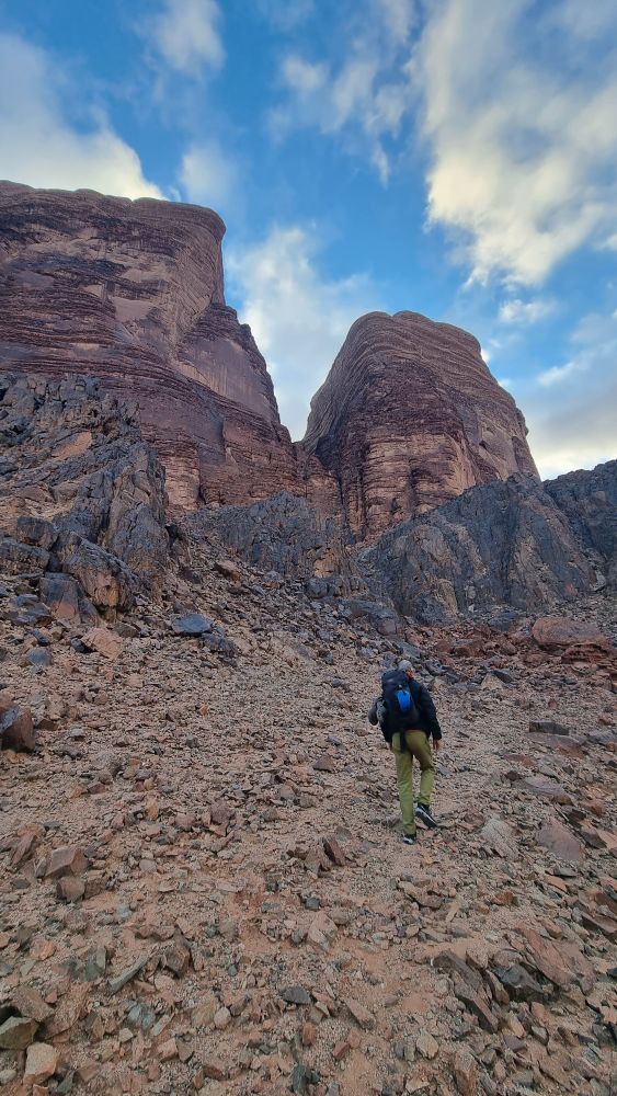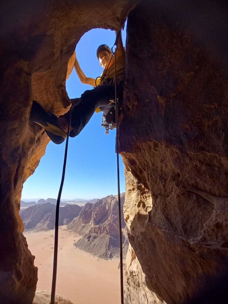 The twin towers of North and South Nassrani were the only major features not ascended by the Bedouin, before the arrival of European climbers. The North peak was finally climbed by the famed Austrian team of Albert Precht and Wolfgang Haupolter in 1990. These two have put up more routes than any other team in Wadi Rum and were renowned for a “no drilling” ethic: “the number of fixed pieces on a route must be counted on the fingers of one hand“.