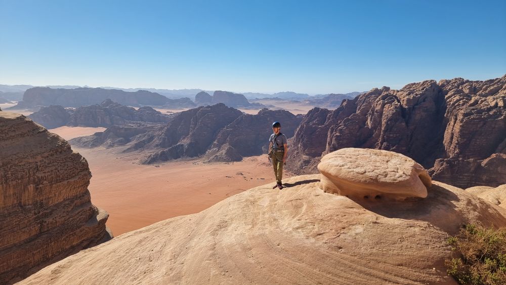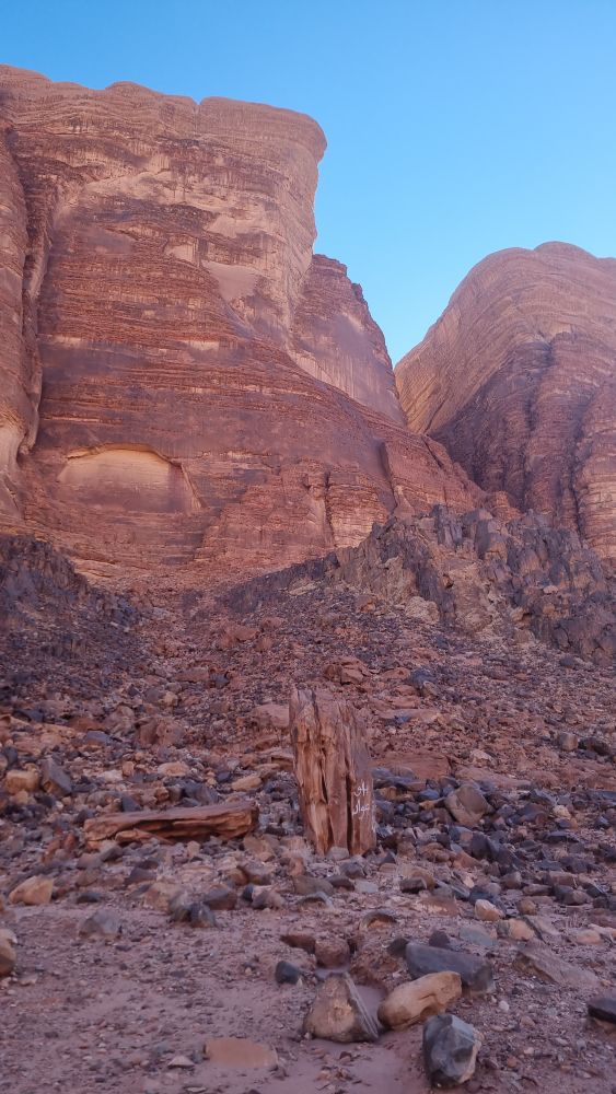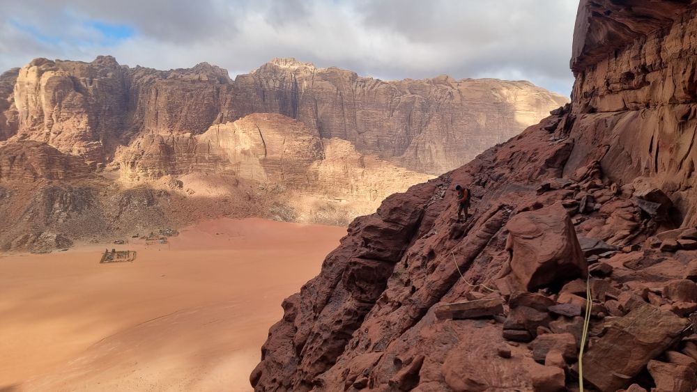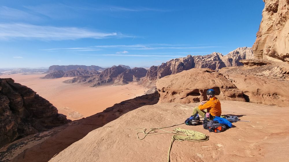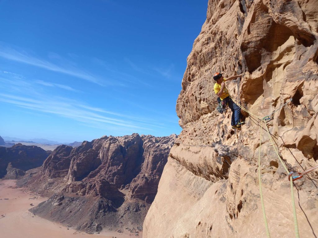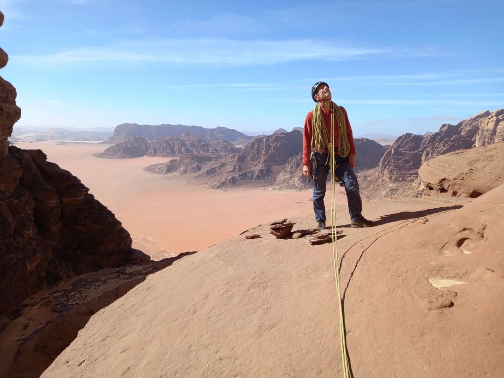 We picked up a much better route down through the scree and as we approached the foot of the crag a headtorch shone up towards us. Surely our boys hadn’t come to our rescue – we were barely after our recently posted ETA? It turned out to be one of the local Bedouin climbing guides, Omar (Hamdan’s Uncle). He was there to pick up a team who’d been planning to descend Hiker’s Road after climbing Guerre Sainte on the other side. We assured him we hadn’t seen anyone and he kindly offered us a lift home. Result! We stumbled into the kitchen on the stroke of 8pm – not too shabby after all.