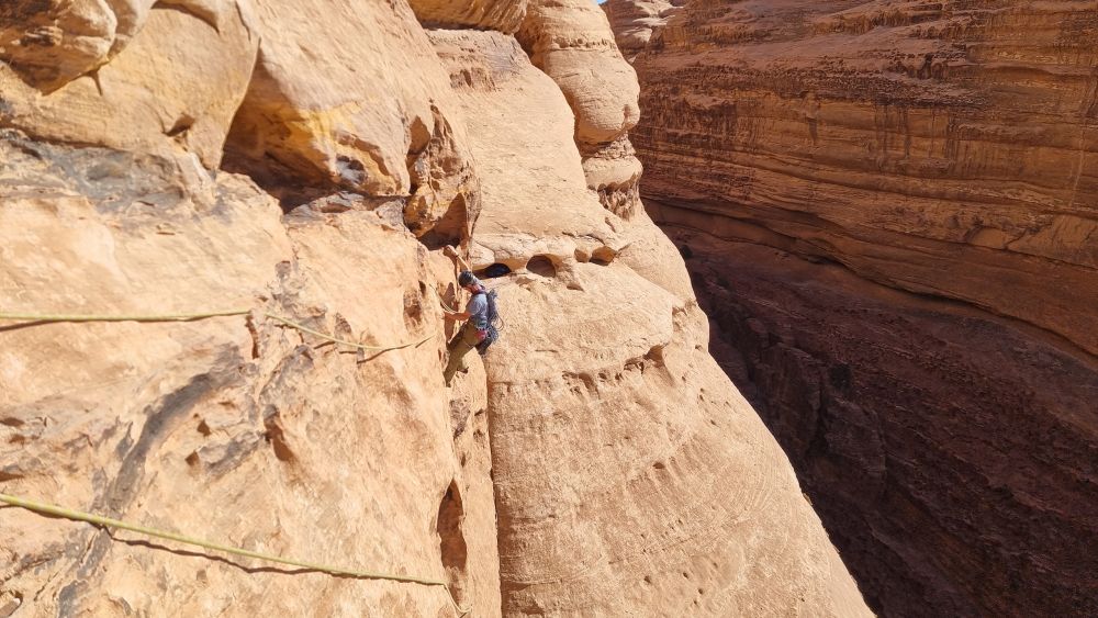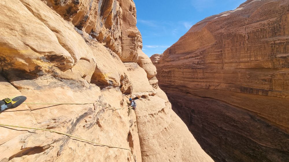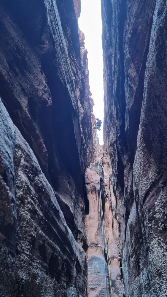 The descent now deviates from the way up, and you make a couple of long raps into the depths of the Siq. The further you go down, the narrower it gets, and it’s all pretty atmospheric by the time you hit the sandy floor. You can barely turn around!