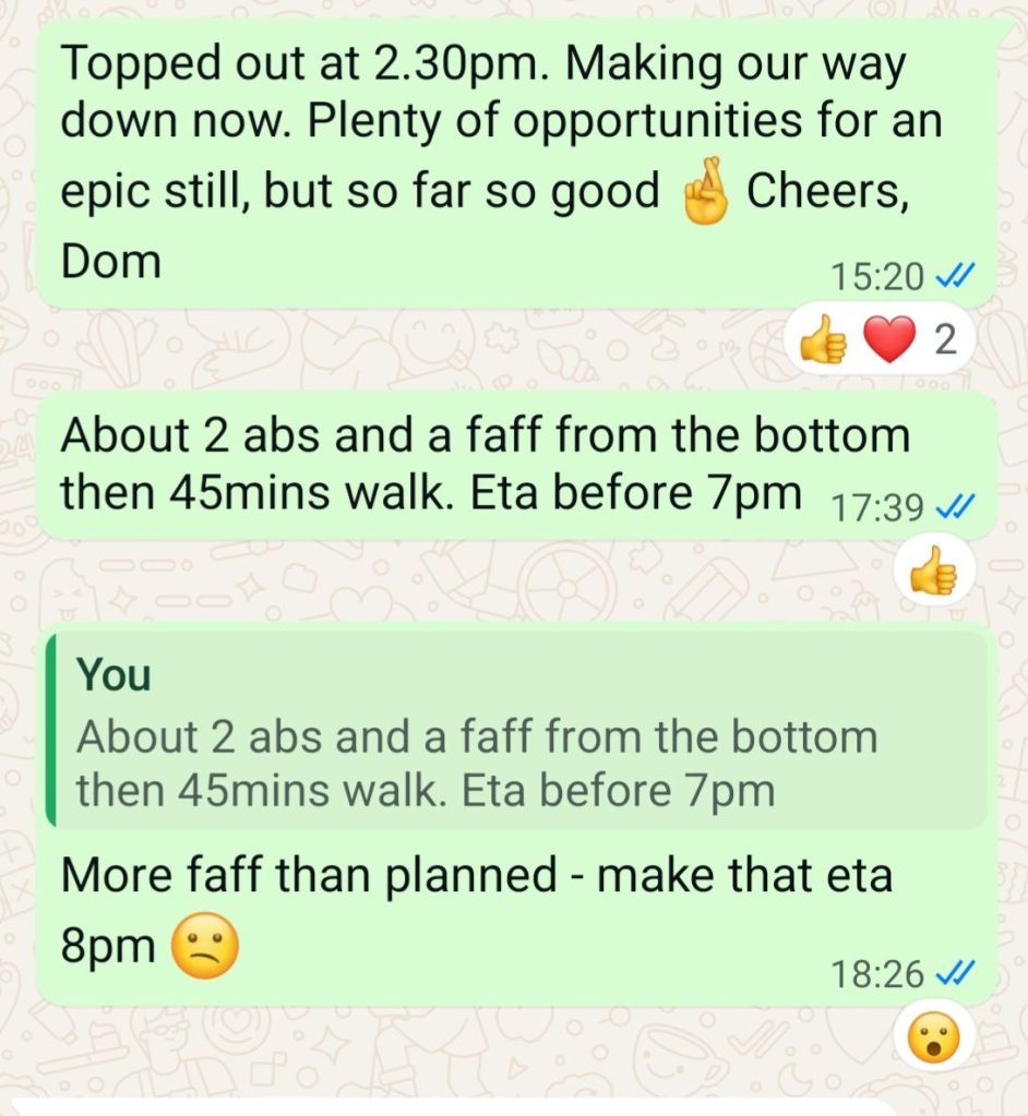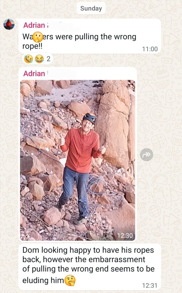 A sandy shuffle is followed by a further short rap off a jammed boulder and you are finally out of the depths and into the world of the largely horizontal for a while. Things are looking good – with careful rope management and a healthy dose of good fortune, the ropes have pulled smoothly on every occasion, it’s 5.30pm and we’ve got another hour of daylight, with only a couple of raps and a bit of faff followed by the 45mins walk back to base. I may have jinxed things with my WhatsApp to the group chat…