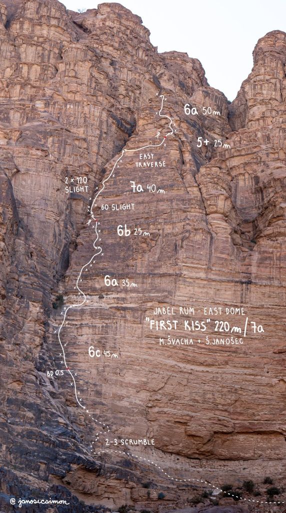 First Kiss was put up by a Czech team, Š. Janošec & M. Švacha, in March 2023. It’s on the left hand side of the Jabel Rum East Face Towers, just right of The Great Siq Route, with 220m of climbing over six pitches: 6c | 6a | 6b | 7a | 5+ | 6a. It’s bolt protected, with just a couple of slings necessary to supplement the fixed gear (a 0.5″ cam is mentioned too, but we couldn’t work out where you’d place it), but with fewer than 40 bolts including belays it’s quite sporty for a “sport route”. Here’s a Topo, courtesy of The Crag and also available on the excellent Wadi Rum Climbers FB page.