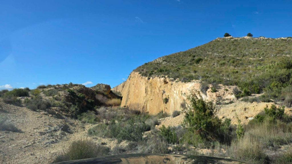 … and one of the weirdest. There’s a huge, impressive escarpment of promising orange rock above the town of Caudete (see further down the post) but this isn’t it. It’s the scabby band at the foot of the escarpment, way over on the left hand side. Perfect for our purposes though, as it is literally one minute from the car and full on South facing.