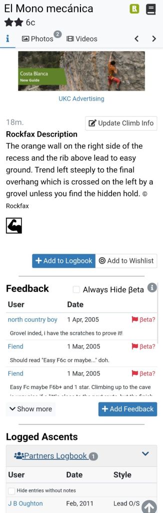 I had a bloody battle with El Mono Mecanica, 6c, (simultaneously slippery as soap and sharp as a razor) which I’d done on my previous visit in 2011, with a 15 year old Jake.