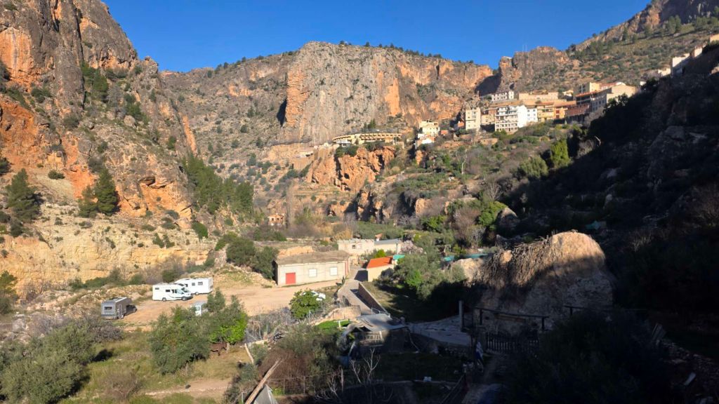 There are no campsites within a reasonable distance of Ayna, but there is an officially permitted van stopover spot, buried in the depths of the gorge beneath the village. No facilities but it does come with a view of the crags through the skylight.