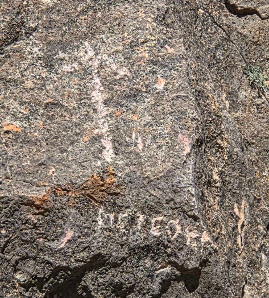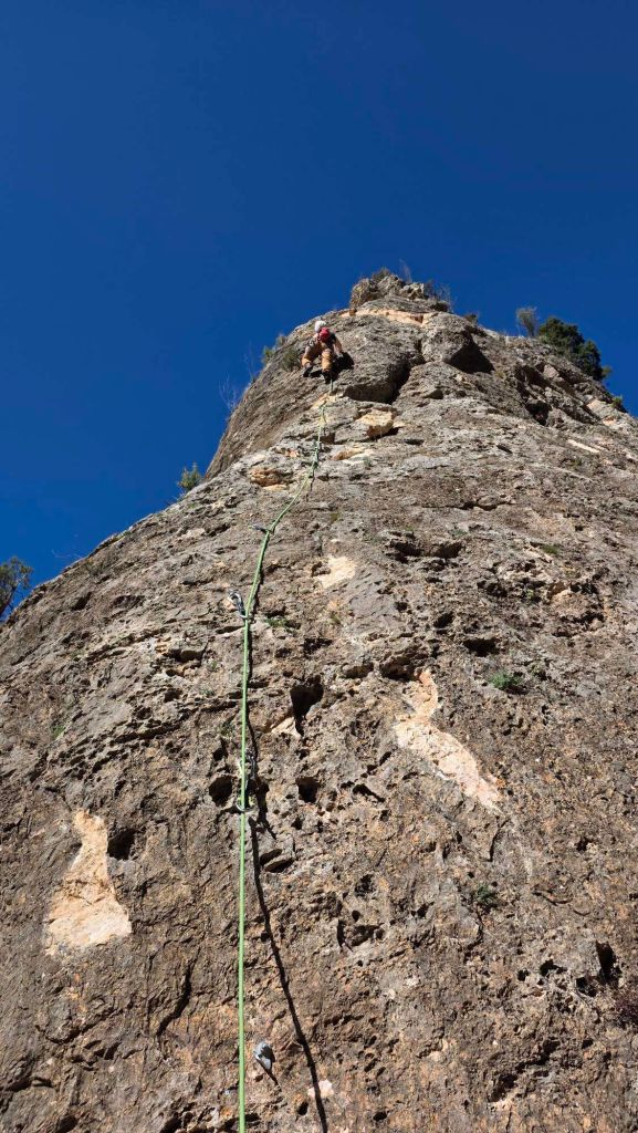 Melon Este is a pretty impressive chunk of rock, with two and three pitch routes to 60 to 80m. I had my eyes on a couple of long 6cs but thought I’d warm up on Meteora, 6a. The old school scratched name should have been a warning of an old school route…