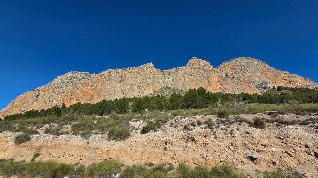 We ended up at a slightly odd campsite in Baza which fancied itself as a “desert experience” but had the merit of being halfway to Granada and handy for the N342. Checking on thecrag it also turned out to be a stone’s throw from some climbing near the town of Zújar. On further inspection, the crag actually features as the most easterly in our new Granada guidebook (Santa really came up trumps this year!) The guidebook says: Zújar is undoubtedly the area with the most future and expansion possibilities in all of the province of Granada. The rock that we will find is also of exceptional quality. We’d scanned the QR code into Google Maps before you could say “escalada” and as we approached the motorway turnoff we were gazing up at a blaze of orange rock slashed across the hillside. Wow!