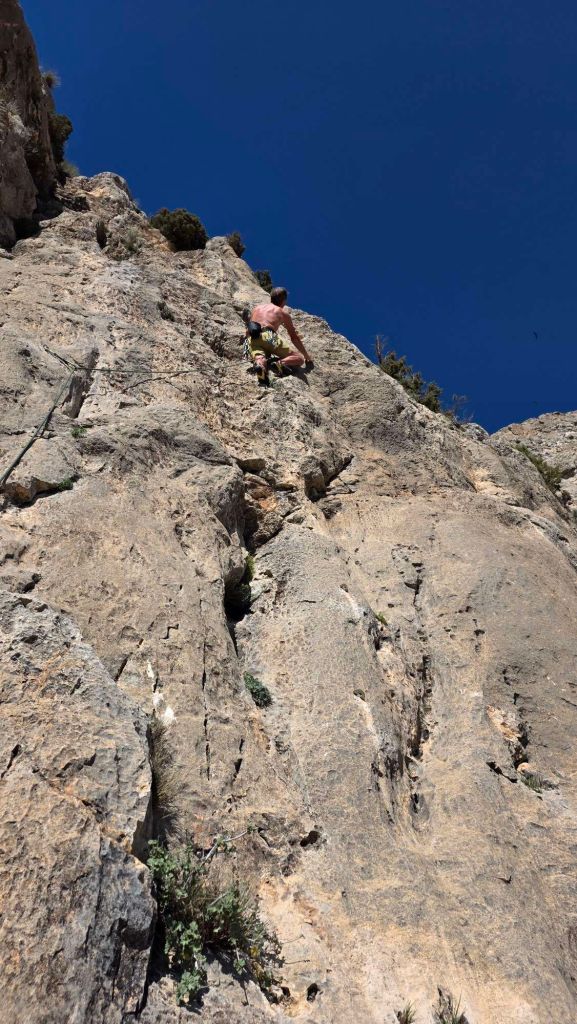 My pride, and my faith in the crag (but NOT the guidebook) were partially restored when I spotted the error in the guidebook (juxtaposition of the righthand two routes) and realised I’d tried to warm up on Quasar, 6b. Pulsar, also 6b and tucked into a corner giving some relief from the sun, was much more reasonable, and we concluded our brief visit with a willingness to return to give Zújar a second chance.