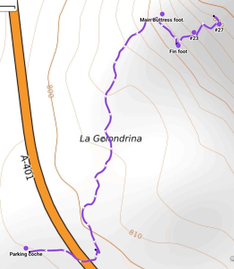 You park on a loop of disused road (coordinates in the guidebook) and cross the road heading slightly rightwards to breach a fence (being careful not to damage it further) before following your nose through scrub, heading for the foot of the main fin.
