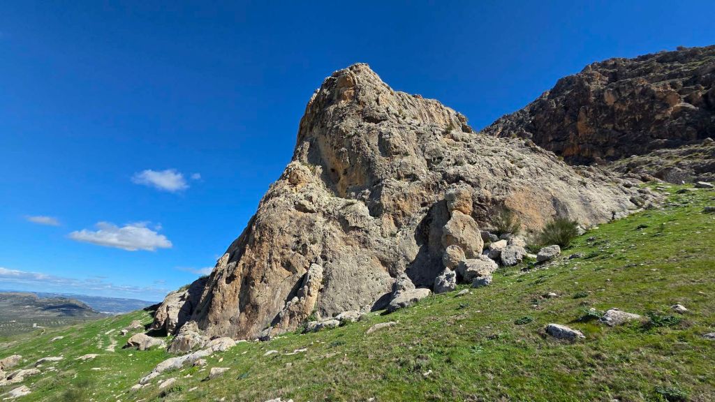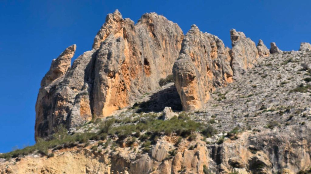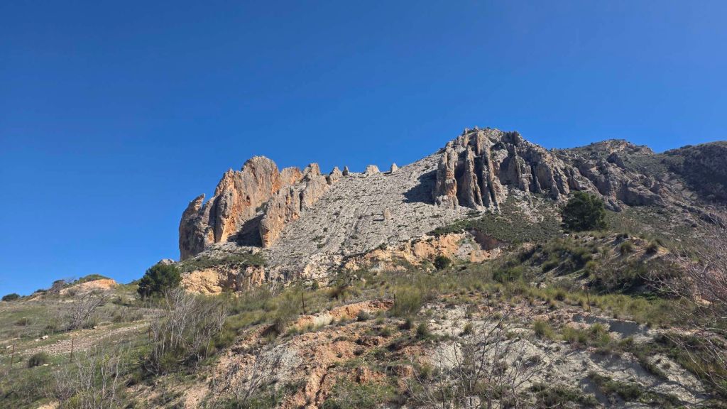 A crag that IS in the Jaén guide is this spectacular rock formation, another 10mins or so east of Bedmar. Its parallel-fin structure is vaguely reminiscent of Lower Sharpnose (… when the tide is a long way out…)