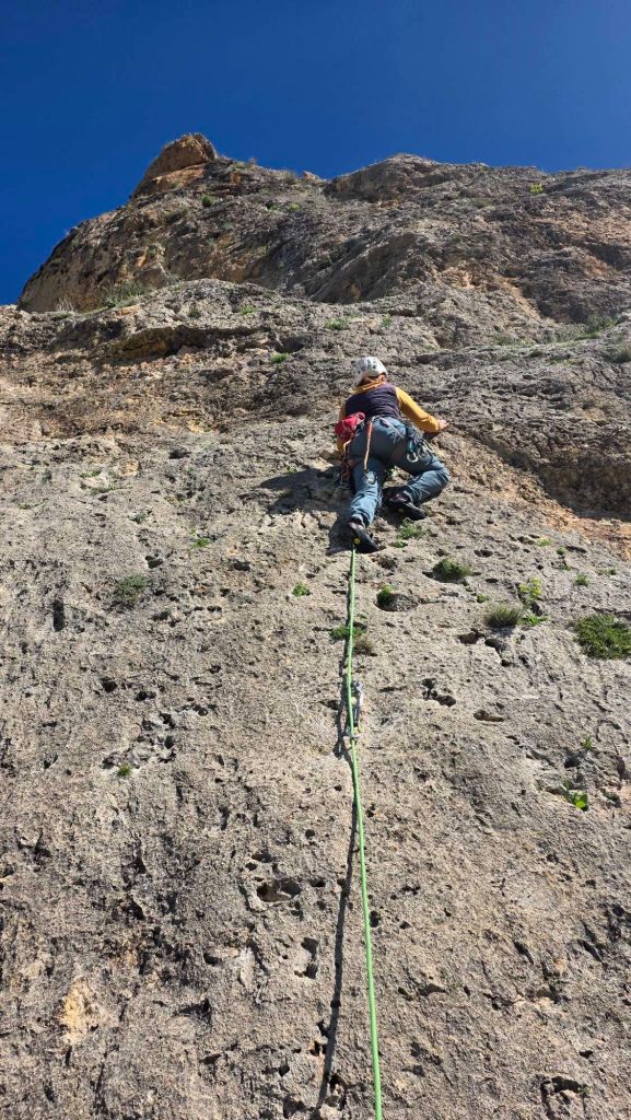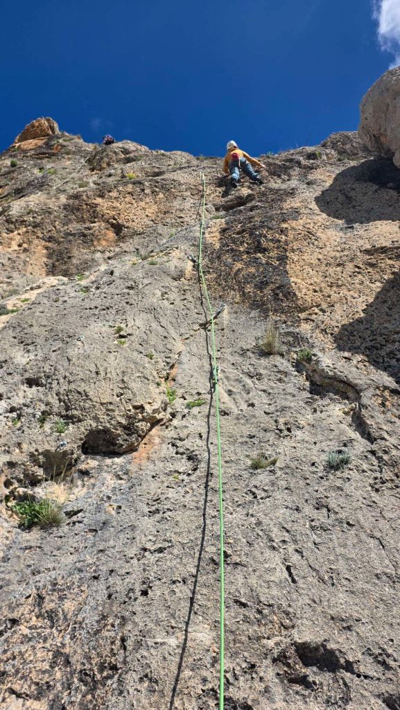 Closer inspection reveals that the climbable rock is restricted to occasional patches along the escarpment, but the good bits are pretty decent. Our first foray was on one of those “looks great in the photos” days, when the unseen hoolie is seriously taking the edge off the enjoyment. Added to which, the westerly aspect makes for shade on most of the crag in the morning, so we started at sector Jartate at the right hand end, which has a more southerly outlook.