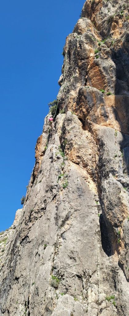 We headed to the far left hand end (Barranco del Buho Izquerda), this time hoping to eke out the shade as long as possible (what fickle folk we climbers are!) Helen was kind enough to give me the first route (in the last of the shade) and I jumped straight on Off Jorse, a two pitch or mega extended 6c of about 45m, with the top half pulling a roof before finishing up a 15m tortured path of gouttes d’eau.