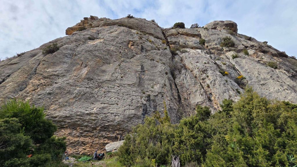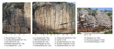 This track (“pista”) isn’t visible on the topo, but runs between two chunks of rock. The left hand chunk contains four routes, juggy if a bit stumpy…