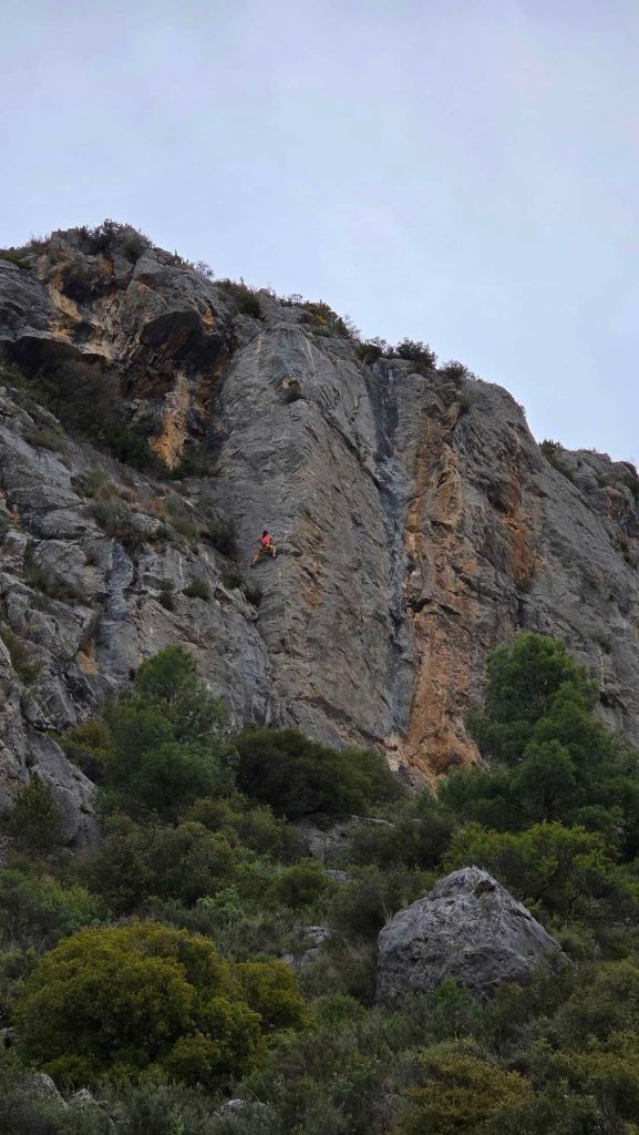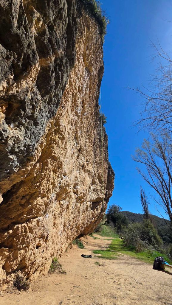 This is a steep bit of rock, and it’s obviously well-used as the rock is polished to a high sheen. There’s a token V+, Nuit de Brujas, at the far left hand end, and you could easily add an extra letter to the grade. Good fun climbing though, if you can ignore the polish (and your ego!) Just to its right, you could apply the same grade inflation to La Niña Psikoneurótika, 6a+, and TBH my arms and my ego were feeling a bit battered. This was a bit of problem, as you’re in to 6b/+ after that and they didn’t look any slabbier. In for a penny, I decided to hop on Los Rokipankis, 6c (I’d rather fail on a 6c than a 6b!) and was somewhat startled to get to the top! Cracking route!