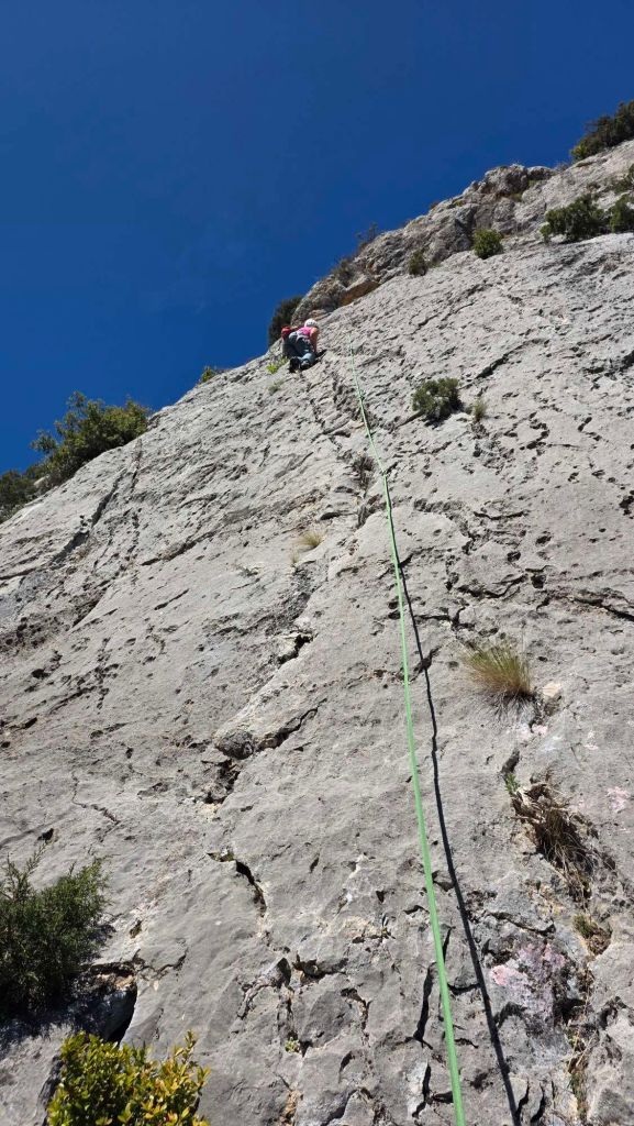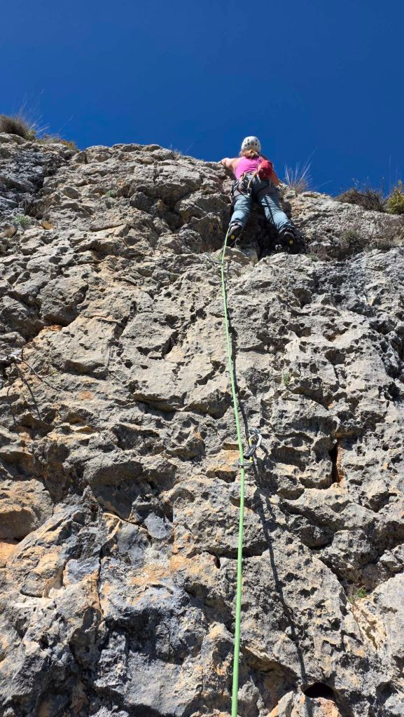 By now the promised sun had arrived (albeit the crag was going into the shade) and it seemed rude not to do another route. Plaça de la Triste Figura was 6a+, but happily no harder than Ursula and better bolted.