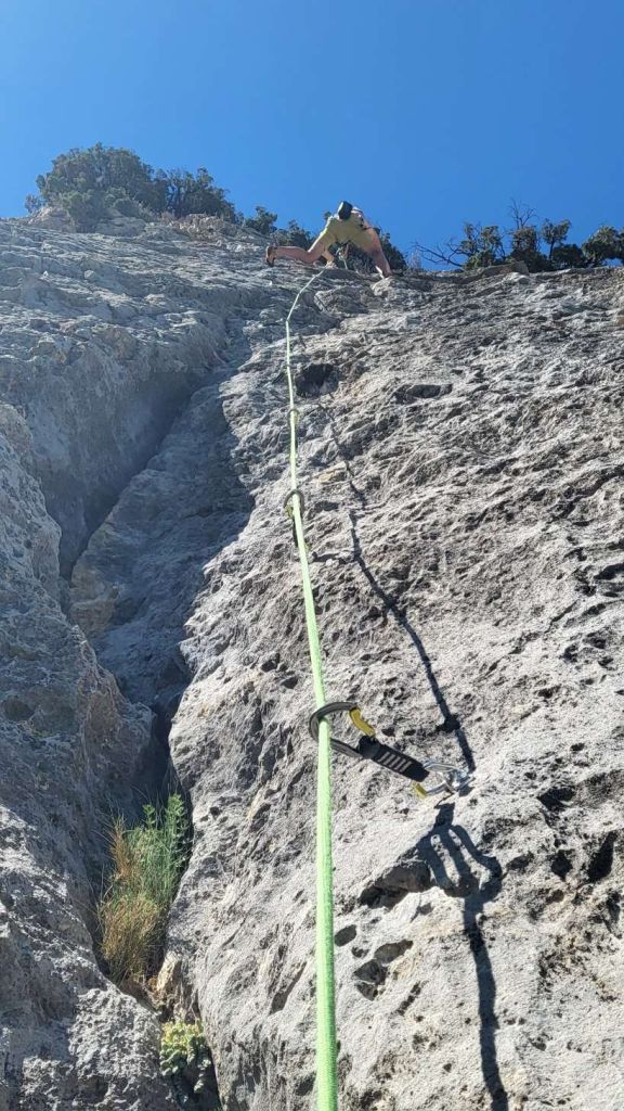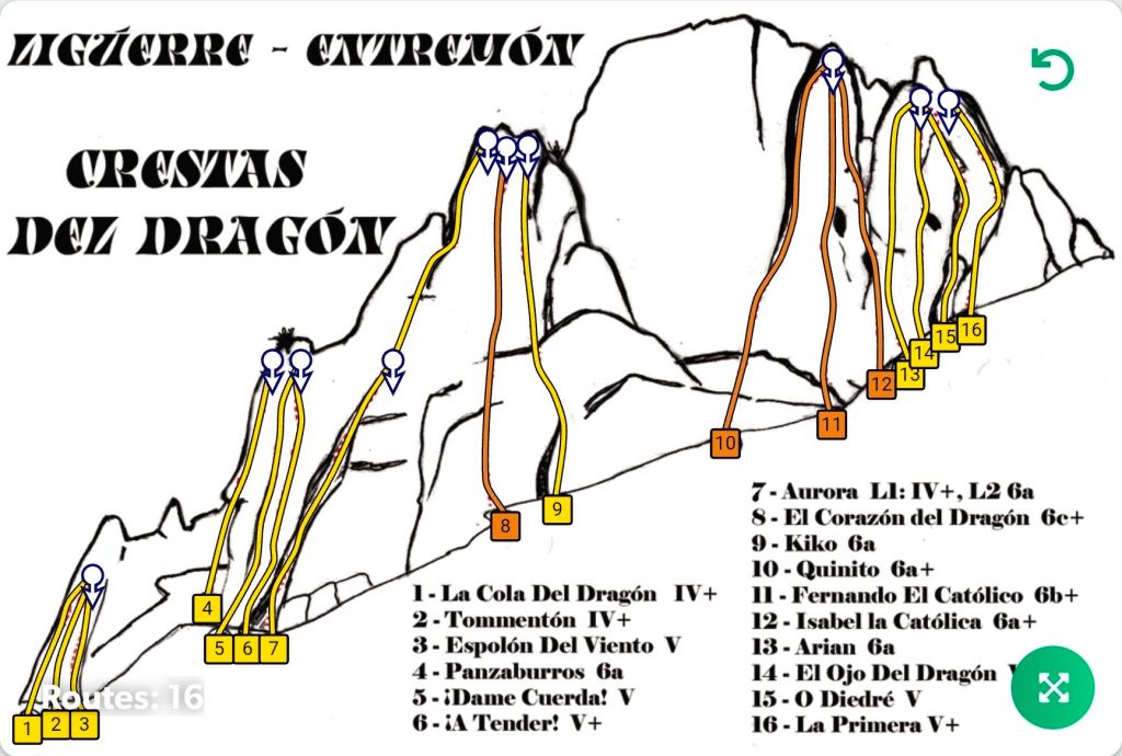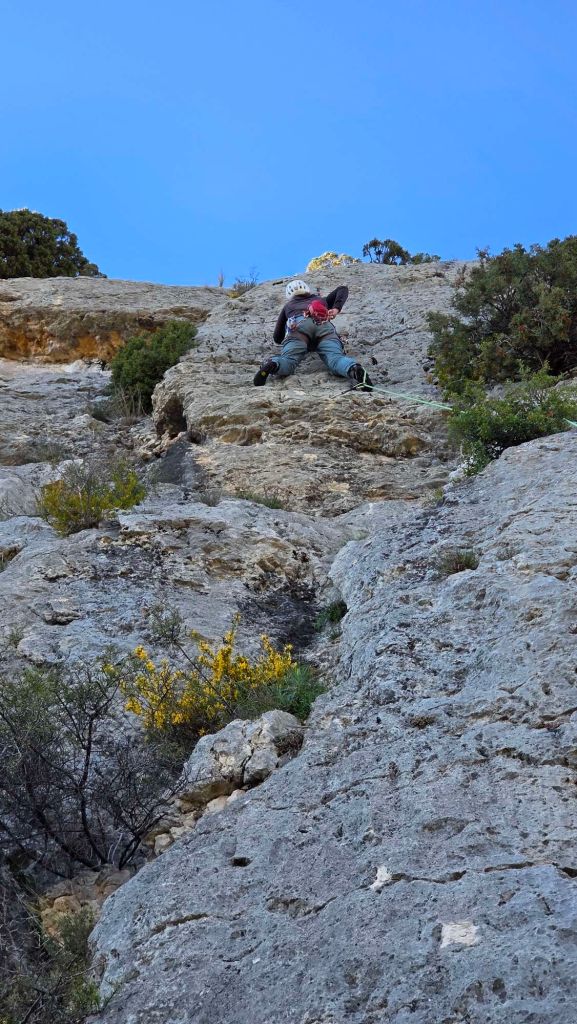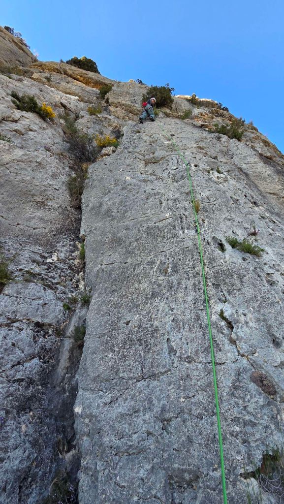 Kiko, 6a, is really good, and not as crumbly as it looks. Fernando El Católico 6b+/c is also recommended (the routes either side get 6b+ in the alternative topo). EI Ojo Del Dragón V+/6a, O Diedré V/V+, and La Primera V+/6a are also worthwhile. Here’s O Diedré…